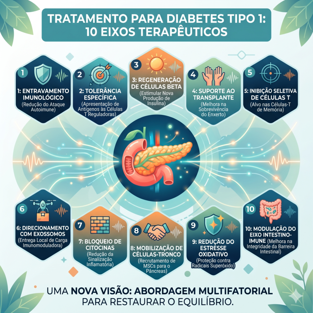 Entender o Diabetes Tipo 1 pode ser complexo, mas a ciência moderna está focando em “atacar” o problema por várias frentes para tentar proteger o pâncreas e restaurar a produção de insulina.
